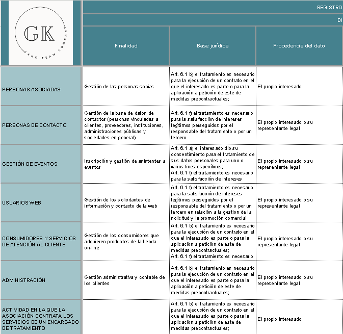 MANA dispone de un Registro de Actividades de Tratamiento donde se detallan cada uno de los siguientes tratamientos realizados como responsable de tratamiento: En el caso, debidamente justificado, que requiera conocer mayor detalle en cuanto al Registro de Actividades de Tratamiento puede dirigirse a MANA mediante cualquiera de los canales identificados.